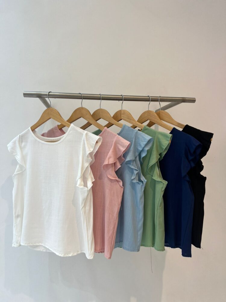 Blusa de simil lino. Cuello redondo. Volados en las mangas. Romántica. Ideal para combinar con nuestra Pollera Aster o el Pantalón Tango liso.