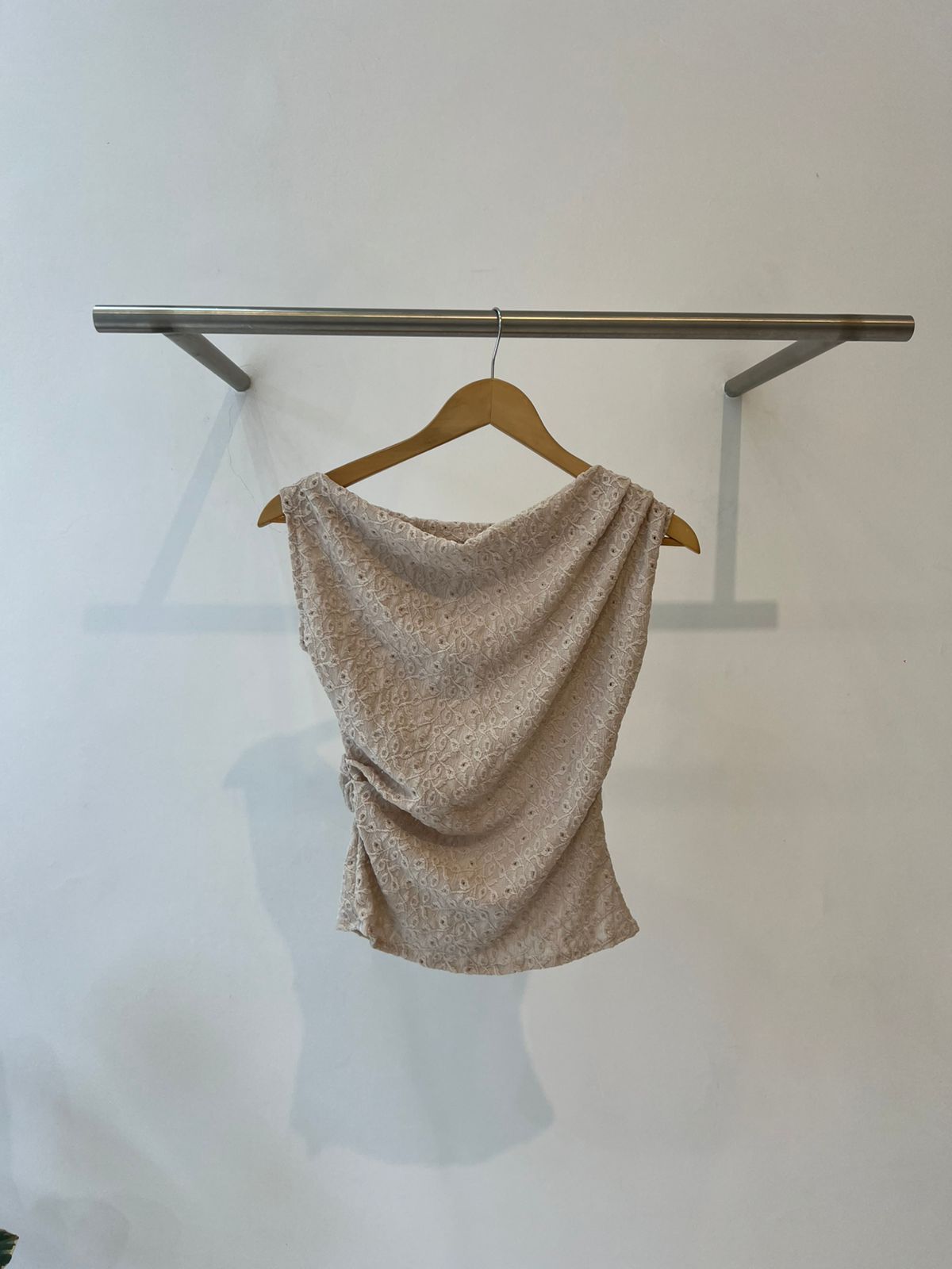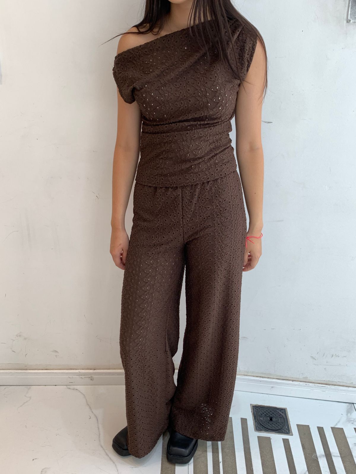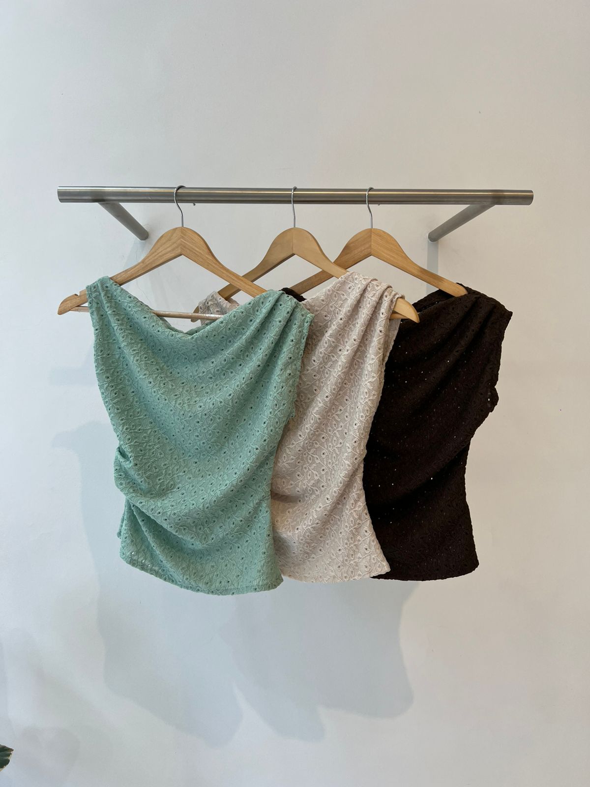 Blusa de broderie de punto. Blusa irregular. Tabla en un hombro y tabla lateral que te marca la silueta. Ideal para el verano. Combina con nuestro Pantalón Lecce.