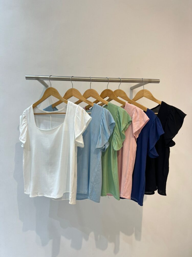 Blusa de simil lino con lycra. Cuello cuadrado. Volados en las mangas. Mangas cortas