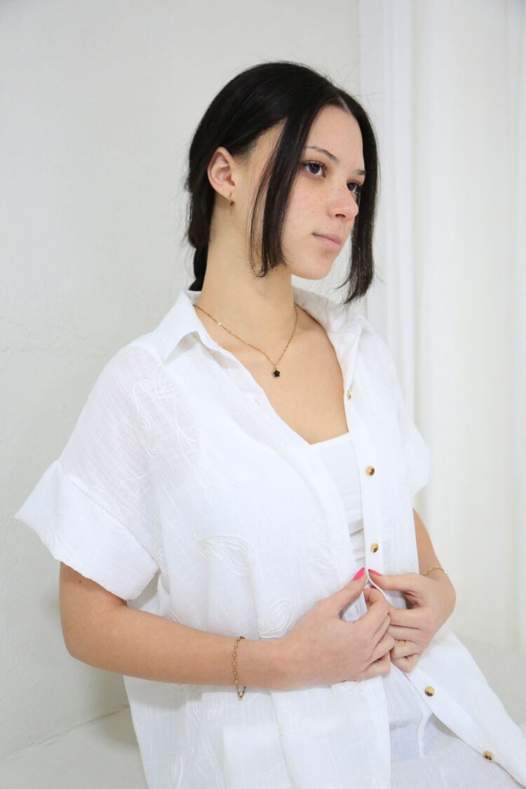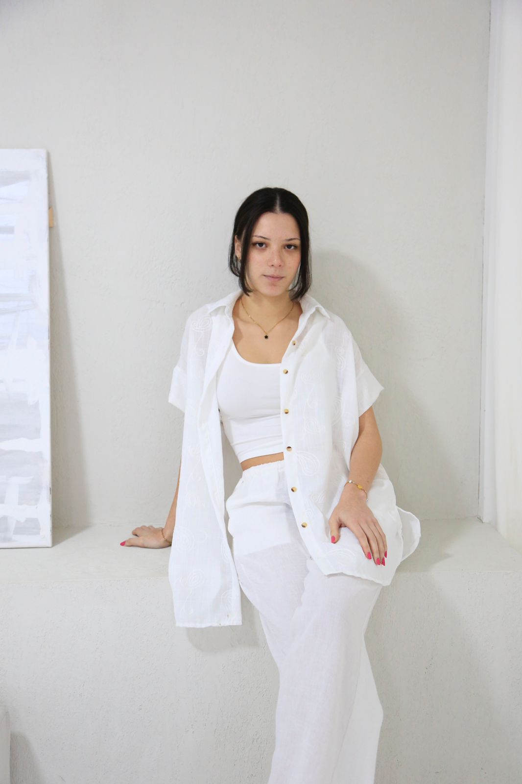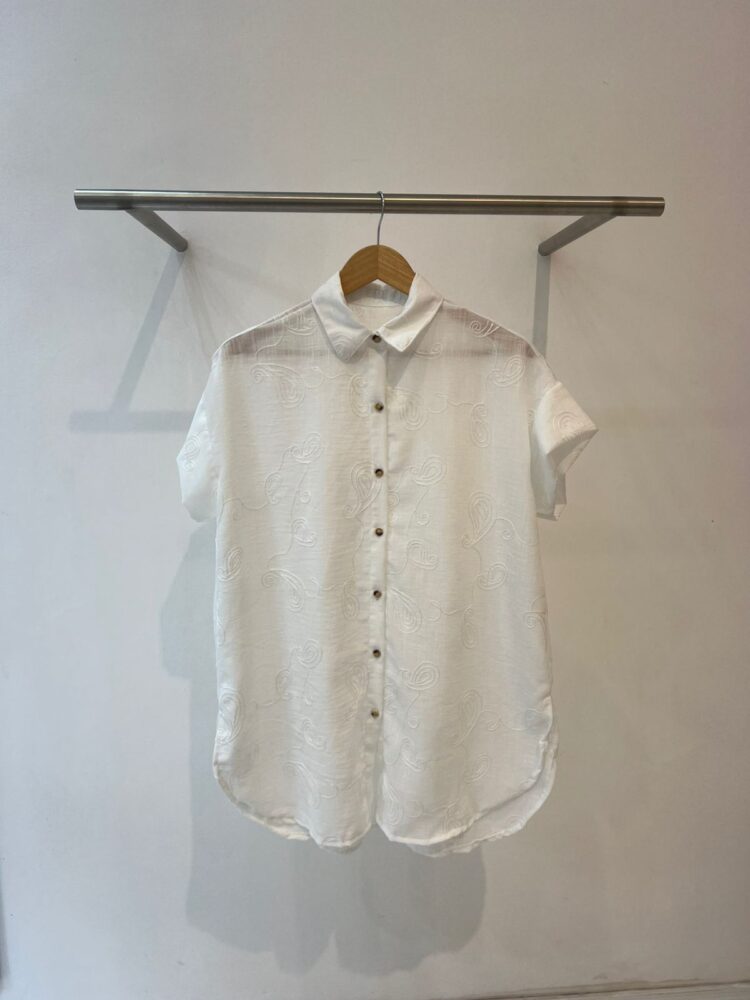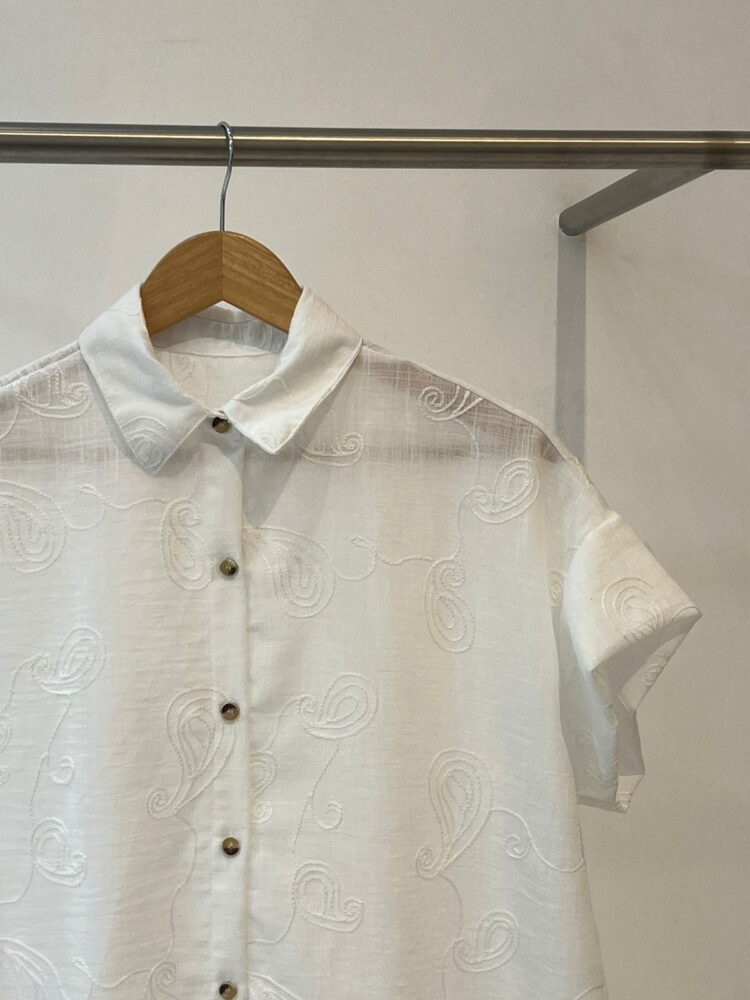 Camisola de lino bordado mangas cortas. Detalles en las mangas. Silueta holgada. Tajo en los costados.