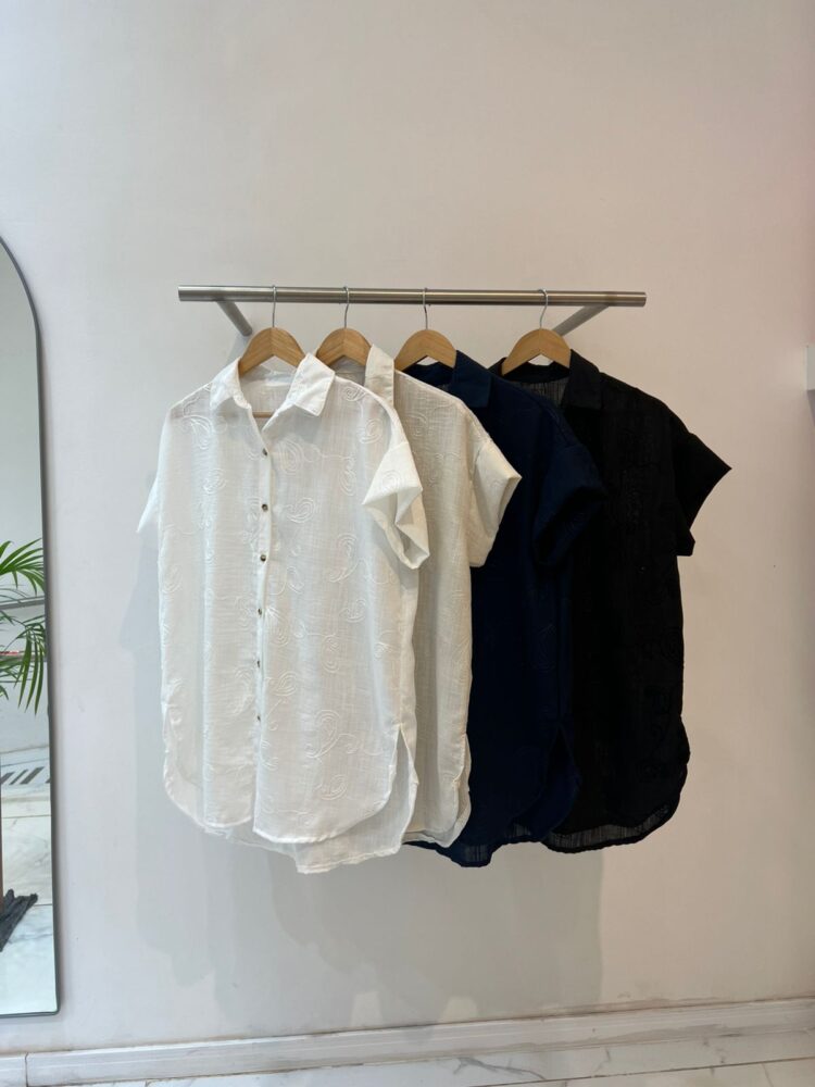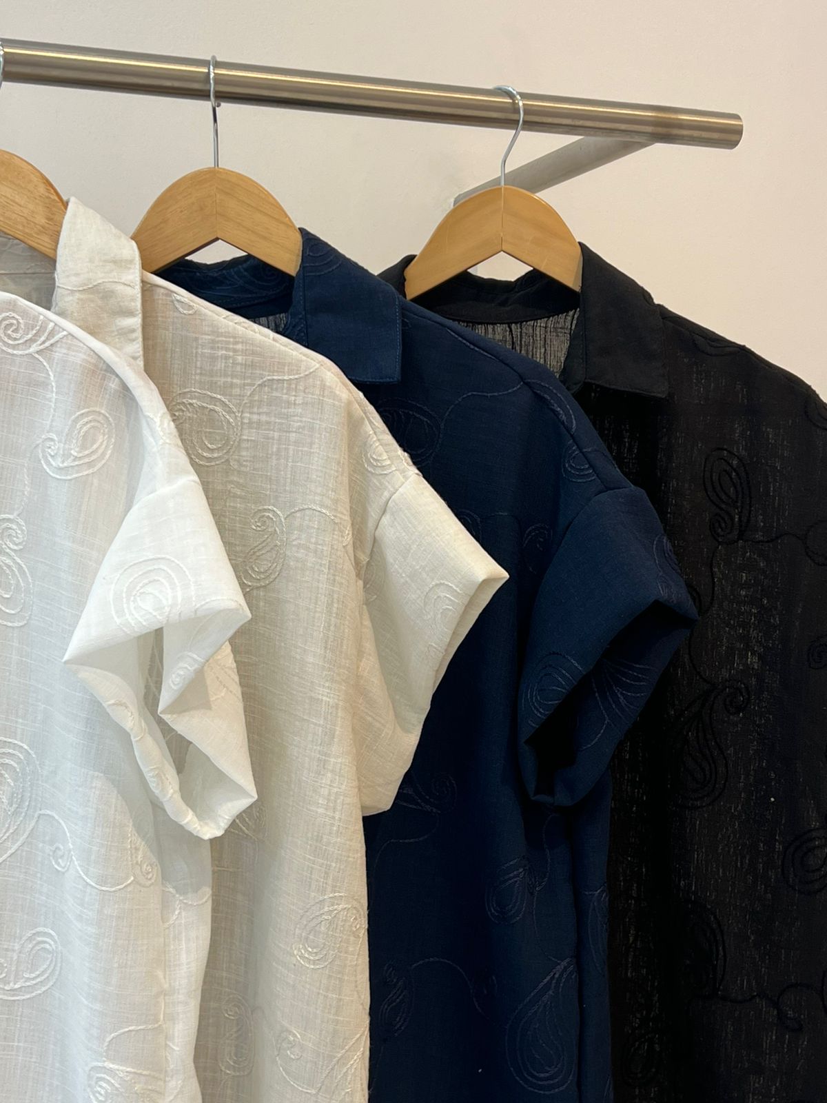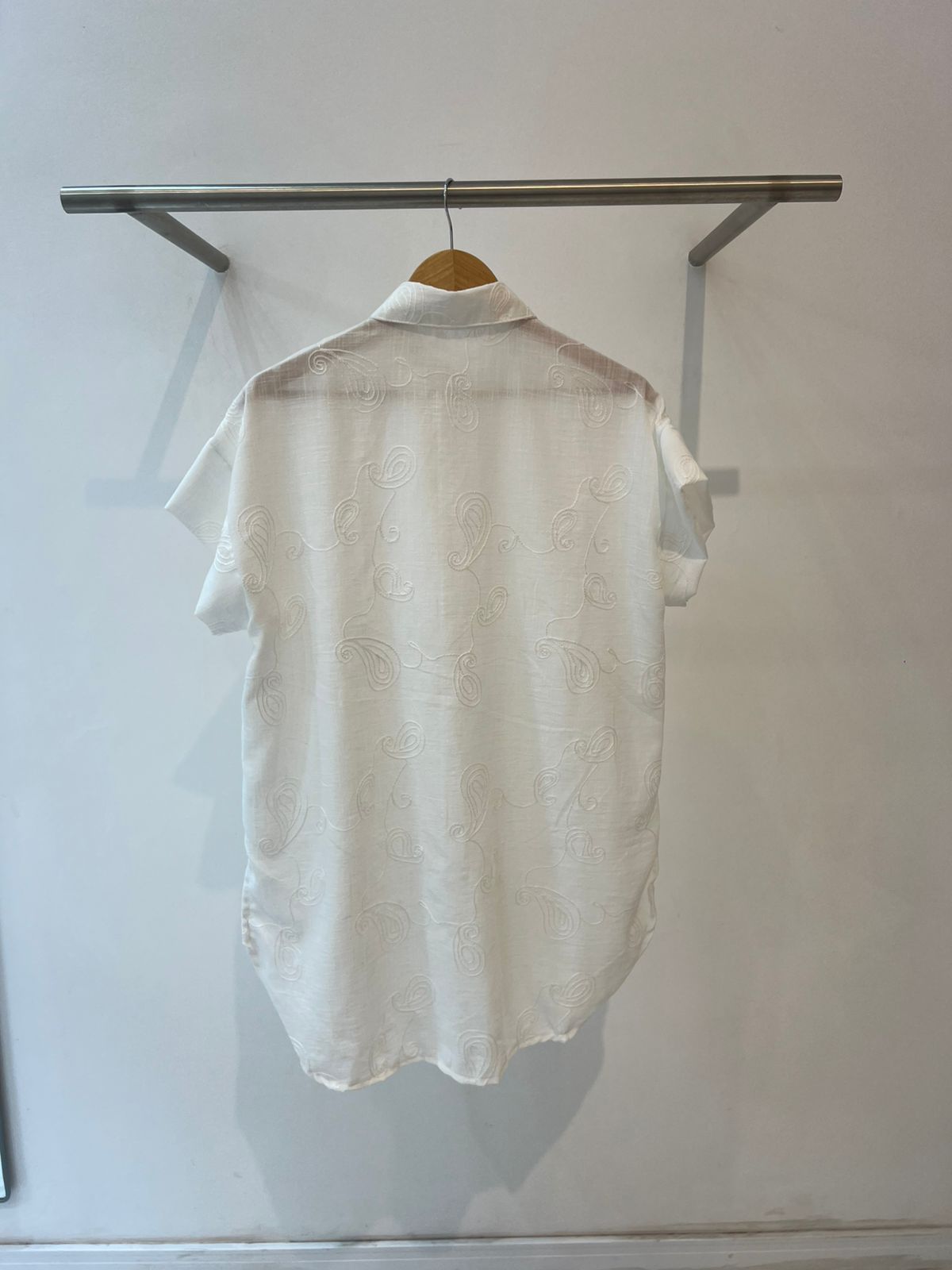 Camisola de lino bordado mangas cortas. Detalles en las mangas. Silueta holgada. Tajo en los costados.