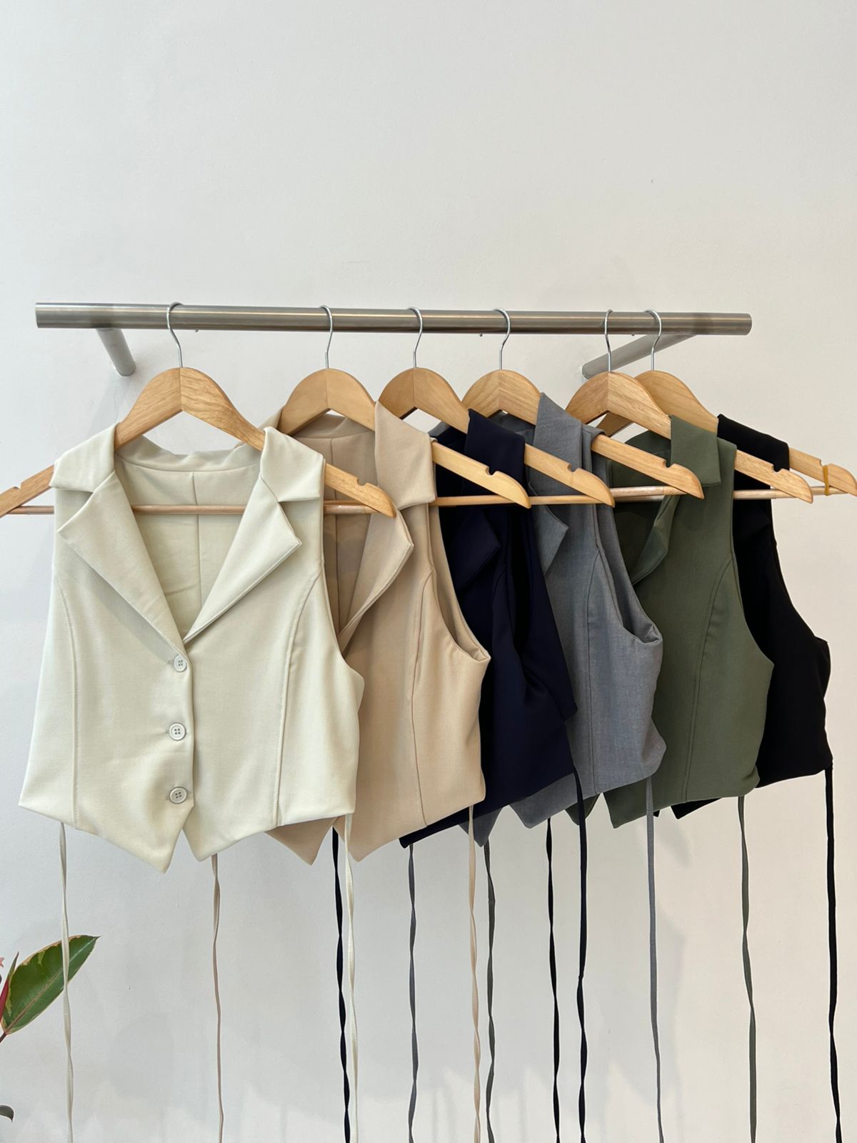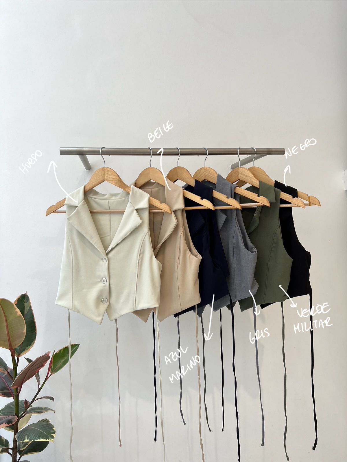 Chaleco de crepe sastrero. Con forro. Botones delanteros. Tira para regular atrás. Ideal para combinar con el Sastrero Dandy, Bermuda Magnolia y Mini Azucena.