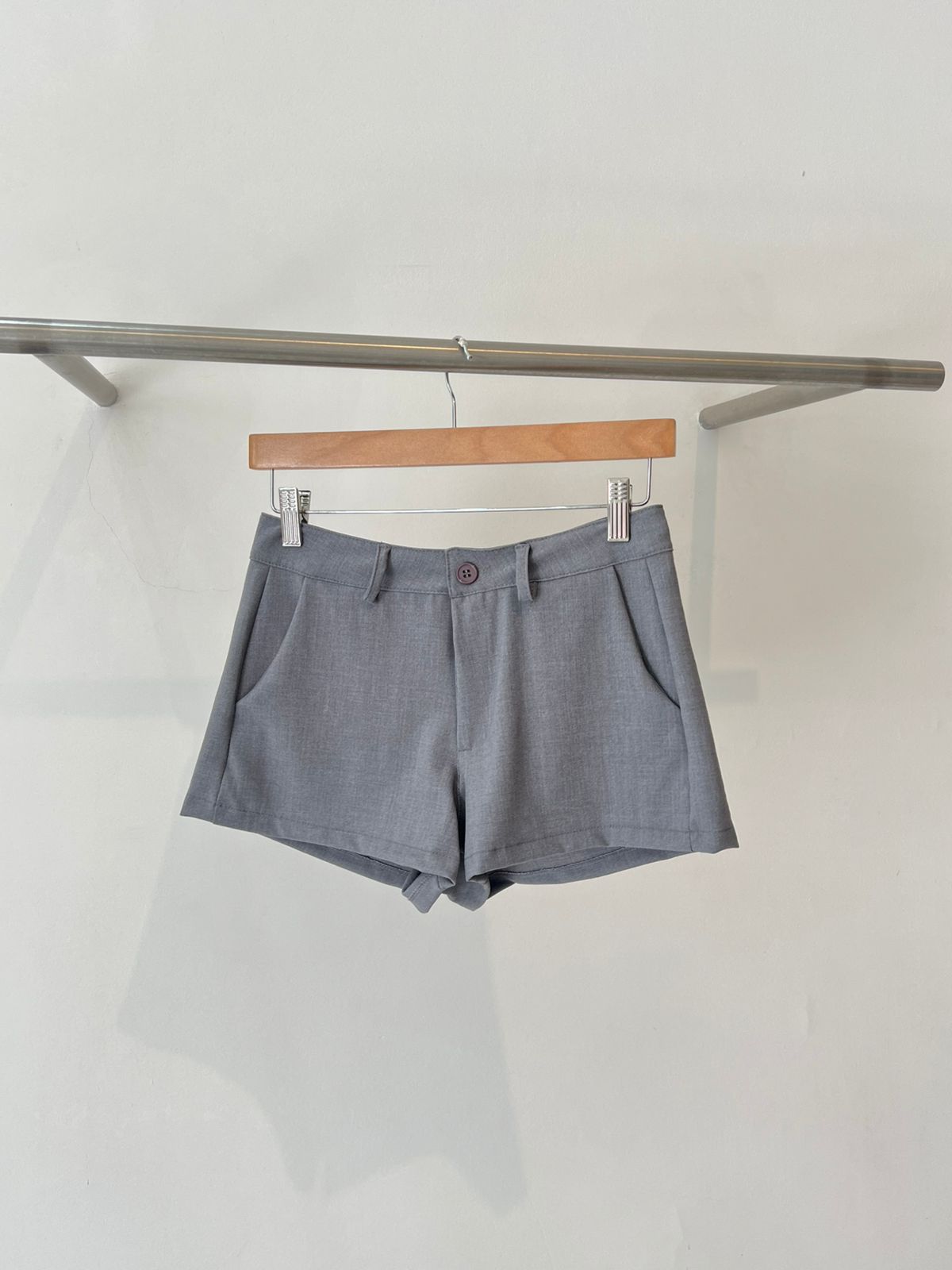 Mini short de crepe sastrero. Con bolsillos laterales. Pasa cinto. Tiro medio bajo.
