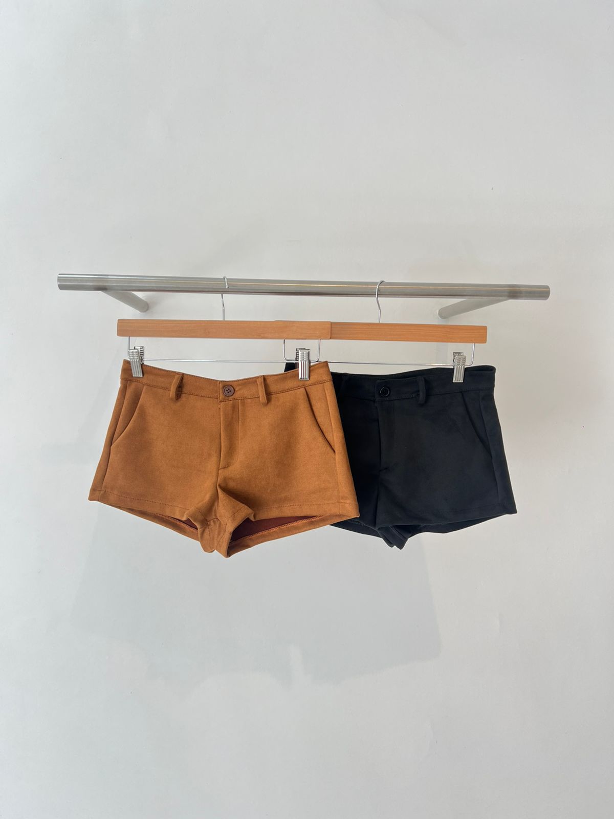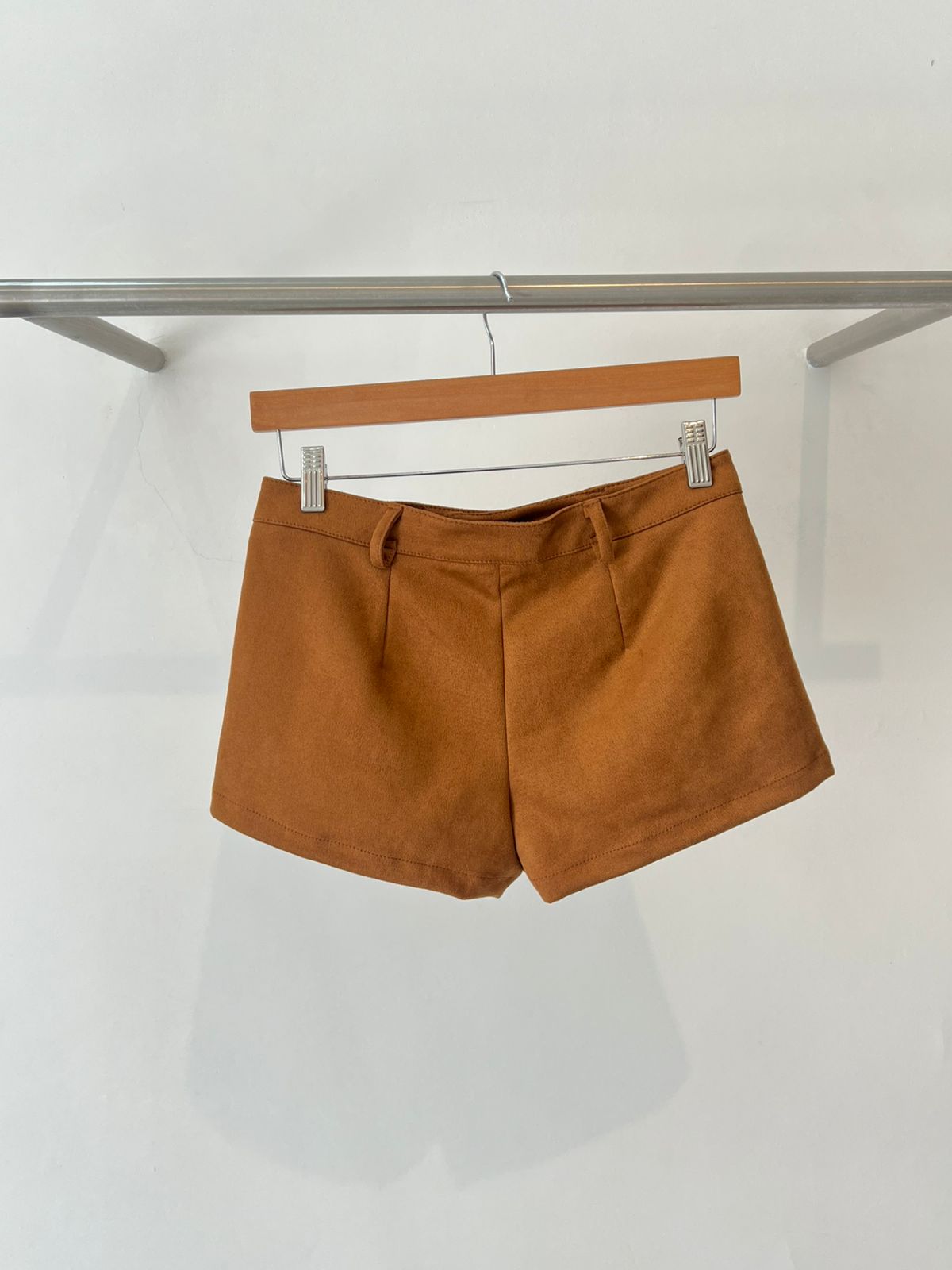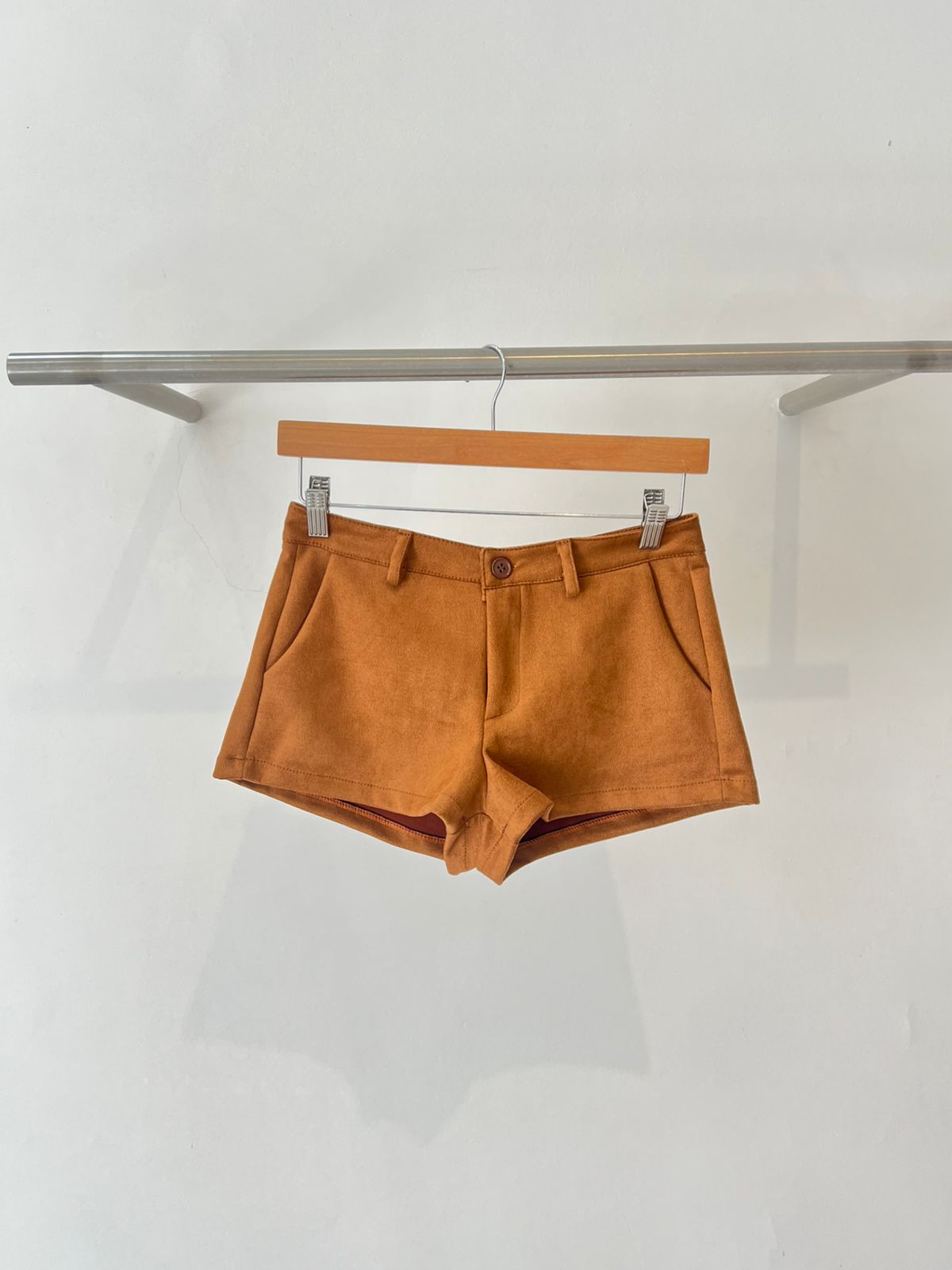 Mini short de gamuza. Con bolsillos laterales. Tiro medio bajo. Super en tendencia. Cómodo y canchero.