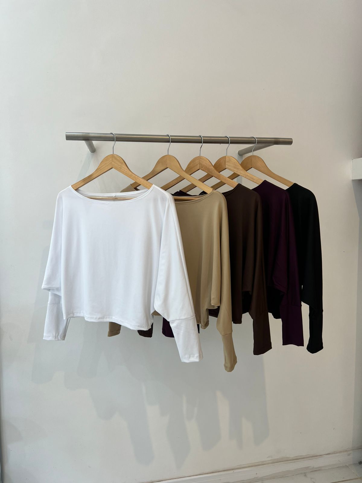 Remera de modal soft. Mangas largas. Cuello bote. Holgada con detalle en las mangas. Super canchera.