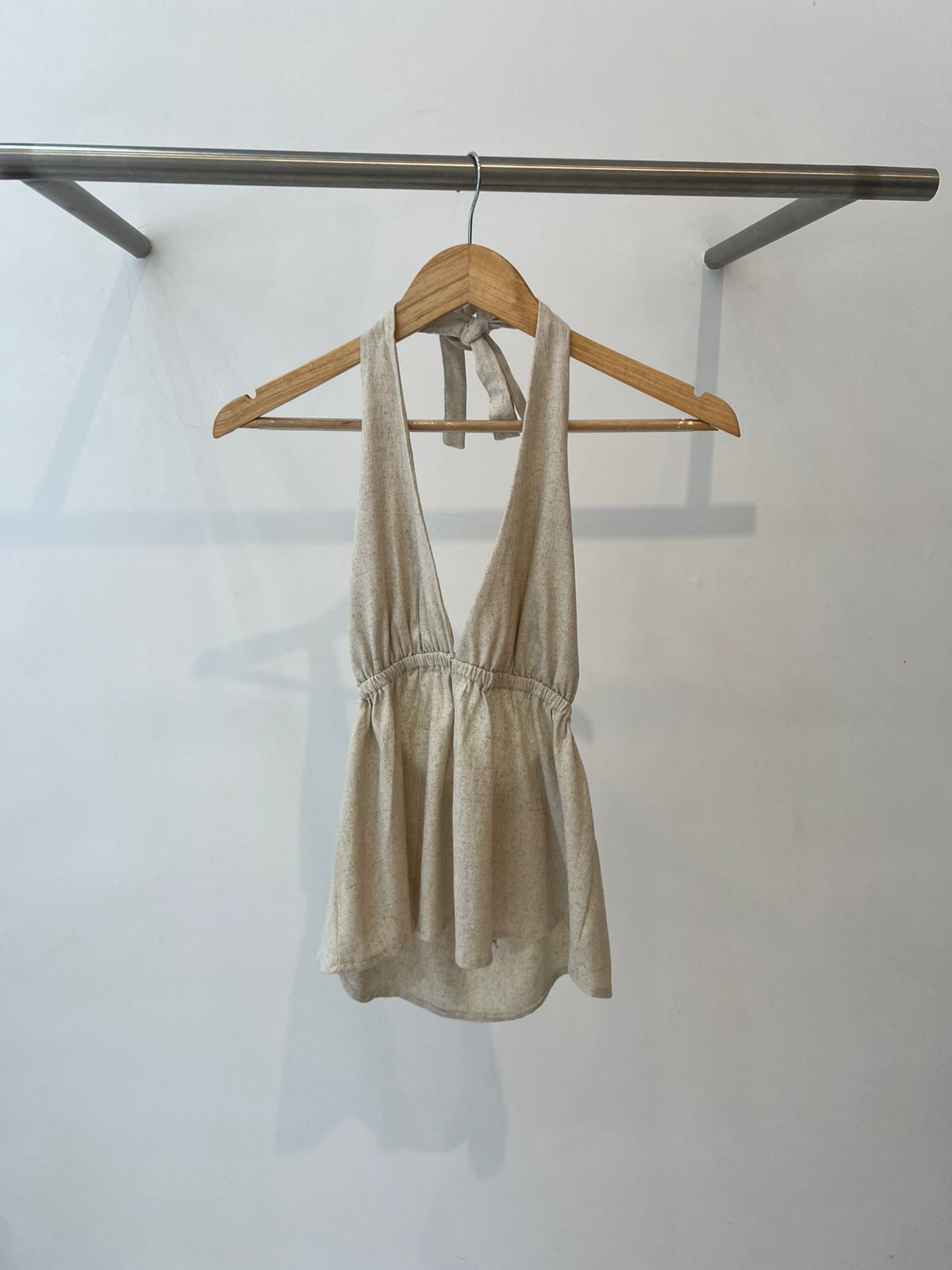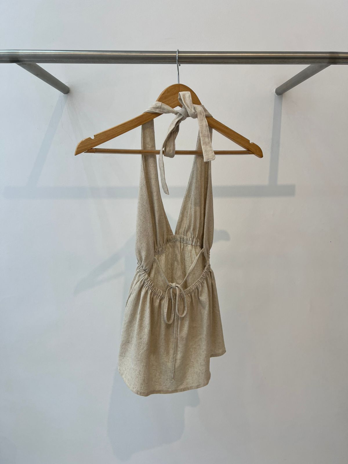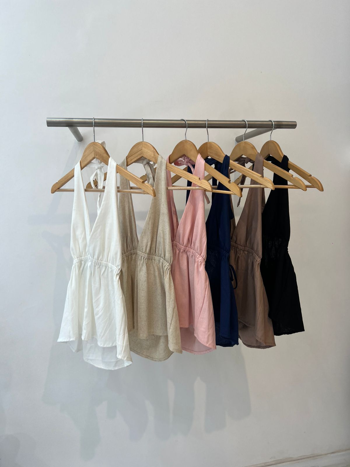 Top de lino sastrero. Cuello halter. Tiras para regular el largo de la prenda. Tiras traseras para regular el busto. Elástico debajo del busto y trasero. Super cancero. Ideal para el verano. Combina con nuestro Pantalón Barletta.