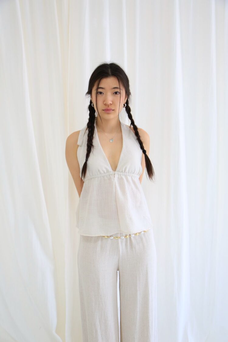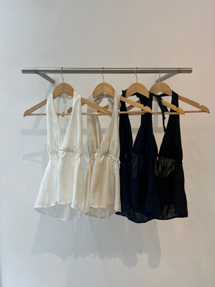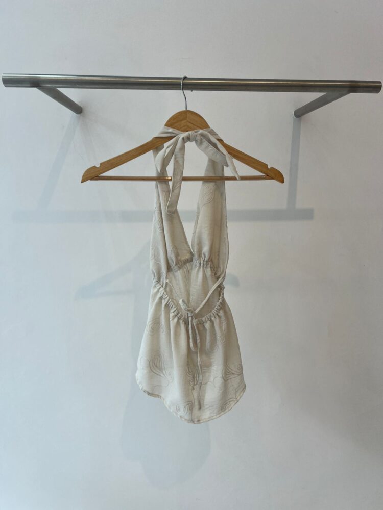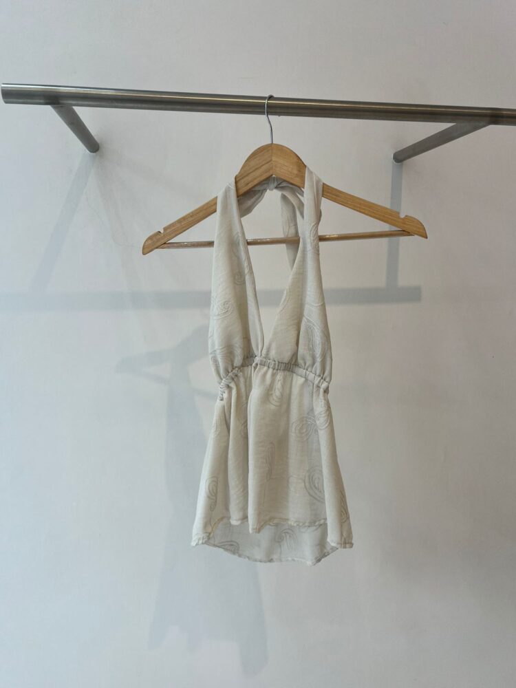 Top de lino bordado. Cuello halter. Tiras para regular el largo de la prenda. Tiras traseras para regular el busto. Elástico debajo del busto y trasero. Super cancero. Ideal para el verano.