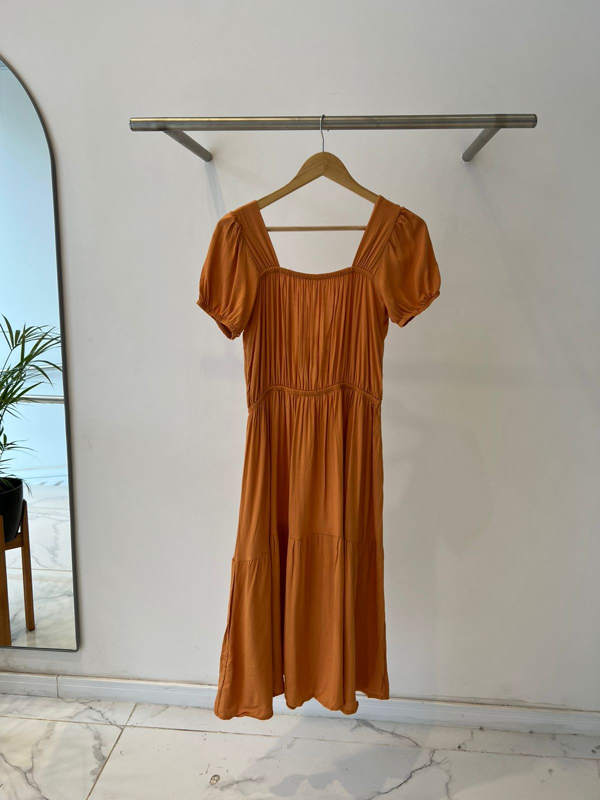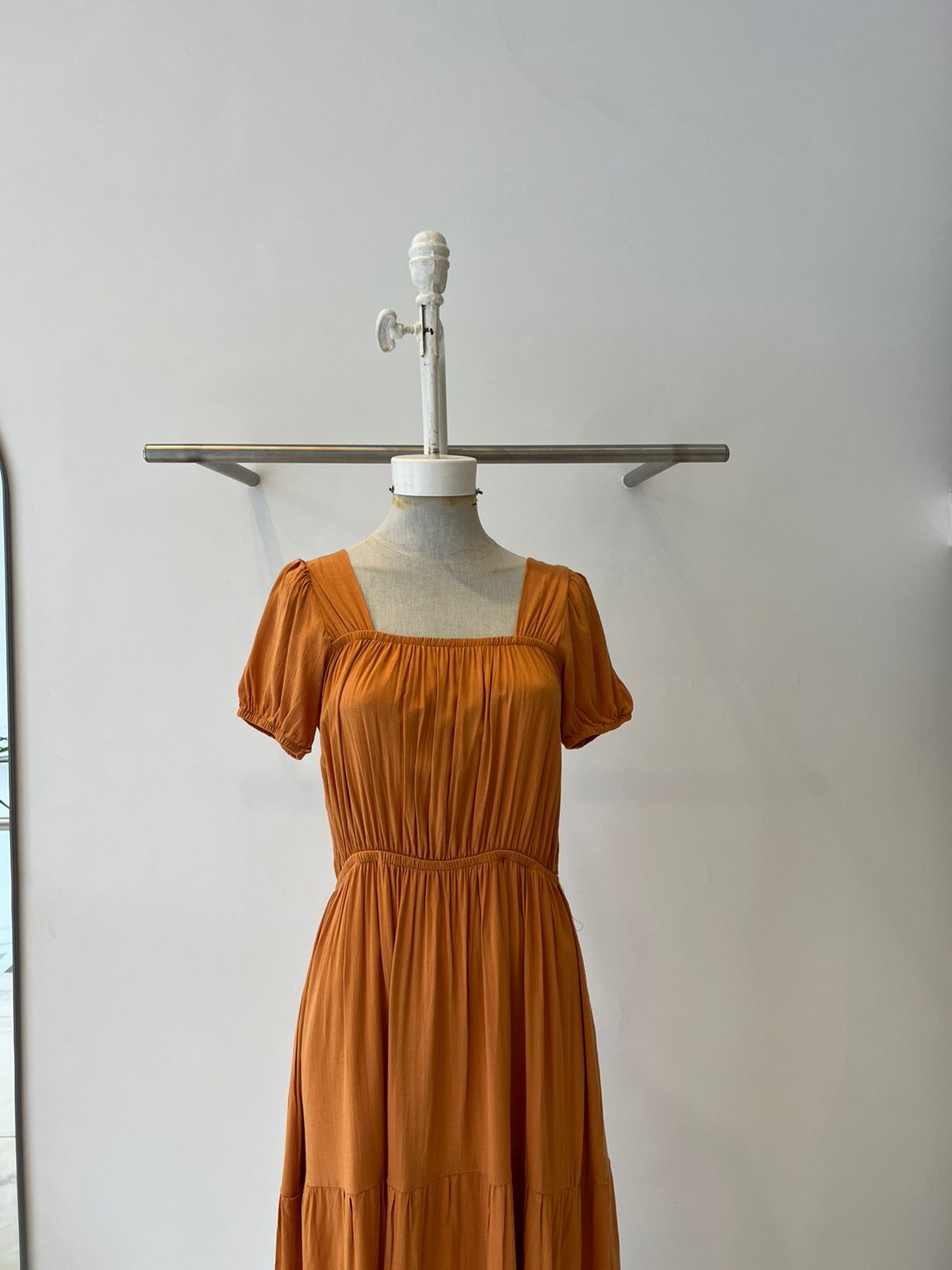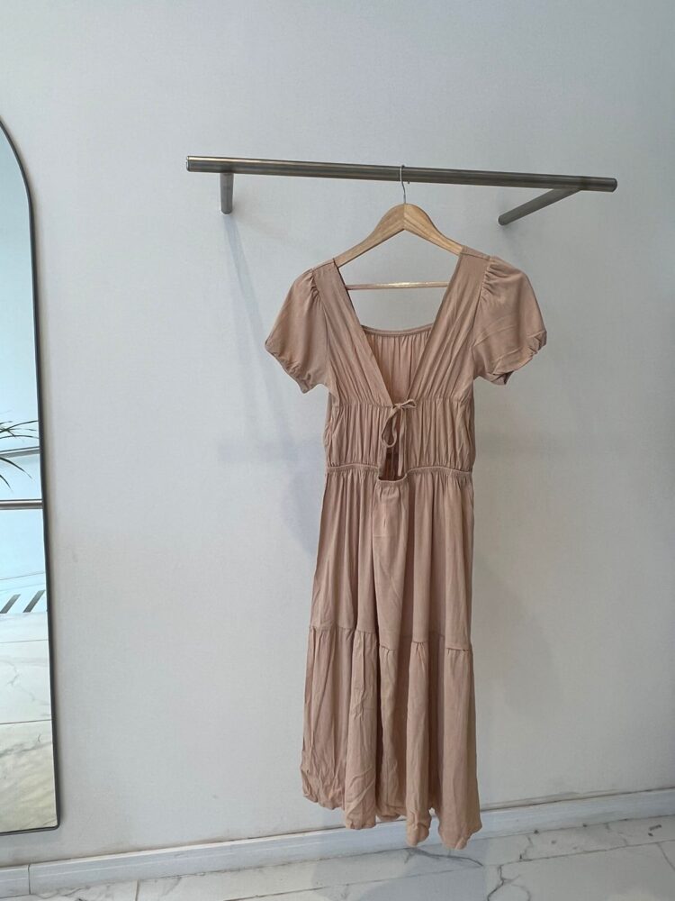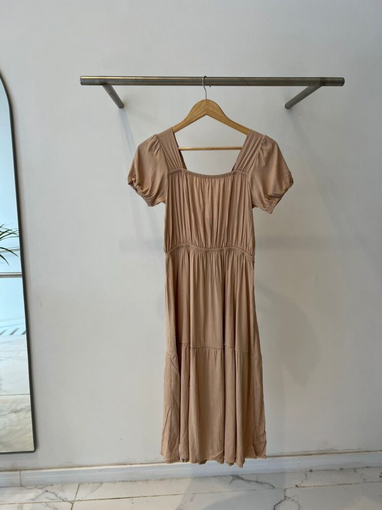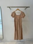 Vestido de lino mangas cortas. Cuello espejo. Con tiras regulables en la espalda. Elásticos en la cintura, busto, mangas.